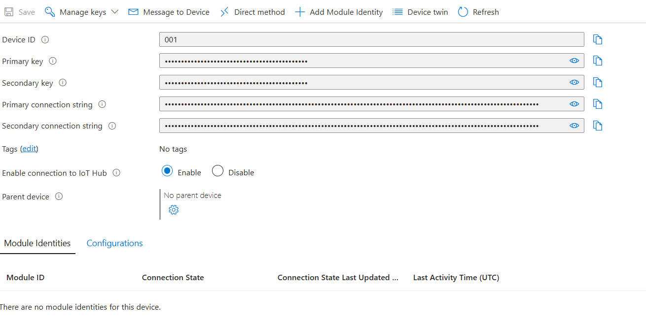 The primary connection string and device here will be used for the connection. The Primary connection string corresponds to the primary key used in API calls.