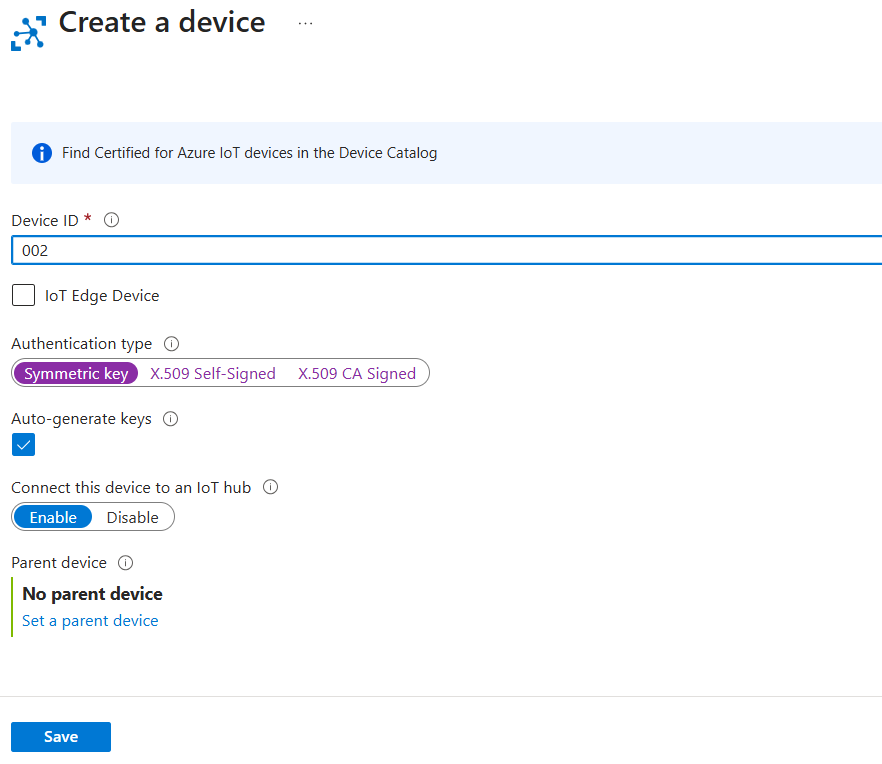 In addition, we choose symmetric key as the Authentication method here, which is the simplest one. The latter two are the self-signed X509 certificate (which is a self-signed certificate) and the CA signed X509 certificate (which is a certificate issued to the device by a CA). Both of the latter two use Public Key Infrastructure (PKI) for device authentication. We are not concerned with the authentication method here, so we choose the first one and simply use key authentication.