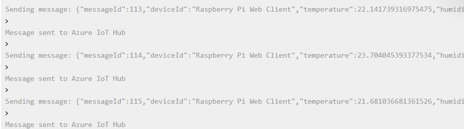 In the code provided by the simulator, we need to replace the connection string with the primary connection string mentioned earlier. Then simply click run, and the sensor will transmit data to the IoT hub. The sensor log is shown in the figure: