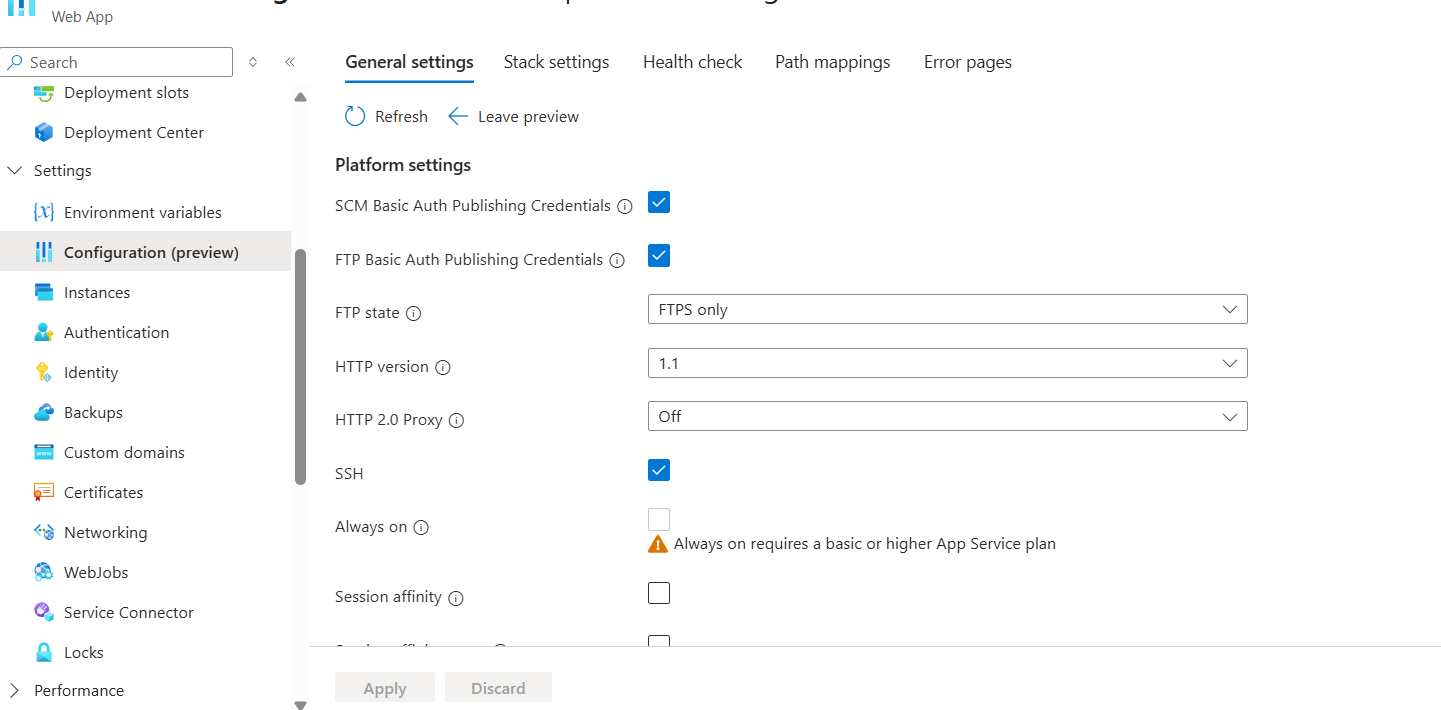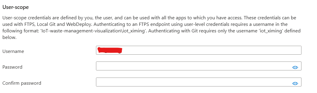 As shown in the figure, we need to open “Configuration” under settings and check both SCM and FTP. Then we open “Deployment Center” under Deployment and find the “Credentials” tab on the far right, as shown in the figure:
