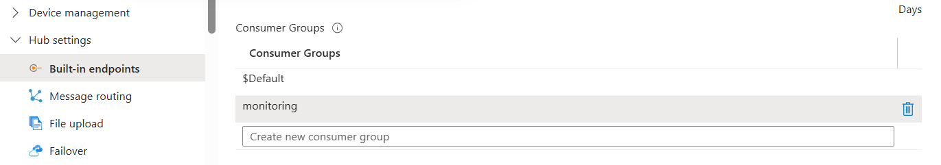 For EventHubConsumerGroup, we also need to open the IoT hub, then find “Hub settings”, then find “Built-in endpoints”. Then, in the Event Hub Details, we find “Consumer groups” and create a group. Here I named it “monitoring”, as shown in the figure.