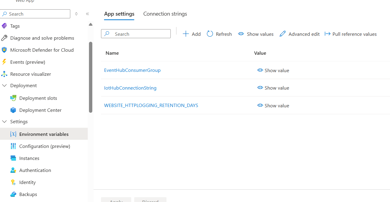 Now let’s configure the environment variables. Open the management interface of the web app you just created in Azure, find “Settings” in the left column, and click on “Environment variables” as shown in the figure.