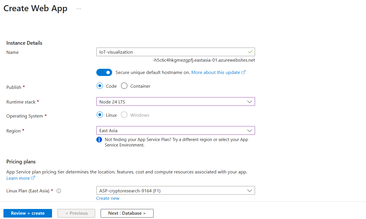 As shown in the figure, there will be Subscription and Resource Group at the top. We should try to choose the same options as before. For the Publish mode, we select “Code”; for the Runtime stack, we select “Node 24 LTS” because the code provided by the IoT device simulator is based on NodeJS. For Region, we still select “East Asia”, and in the pricing plan below, we select “Free” to save money.