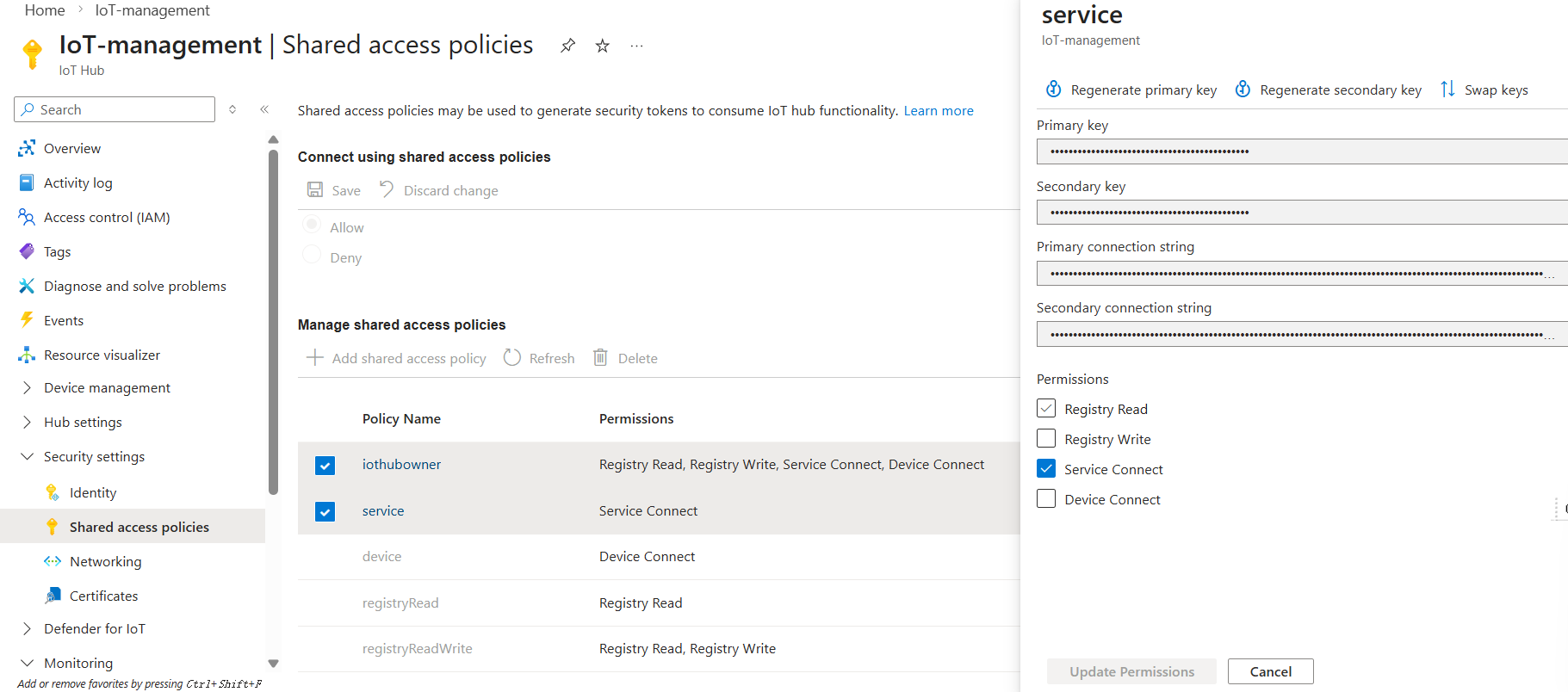 (There should be nothing there; my screen shows it after configuration). We need to add two items: IotHubConnectionString and EventHubConsumerGroup. For IotHubConnectionString, open the security settings in the IoT hub we created at the very beginning, find “Shared access policies”, and then click “service”. As shown in the figure, the primary connection string will appear; that’s it!