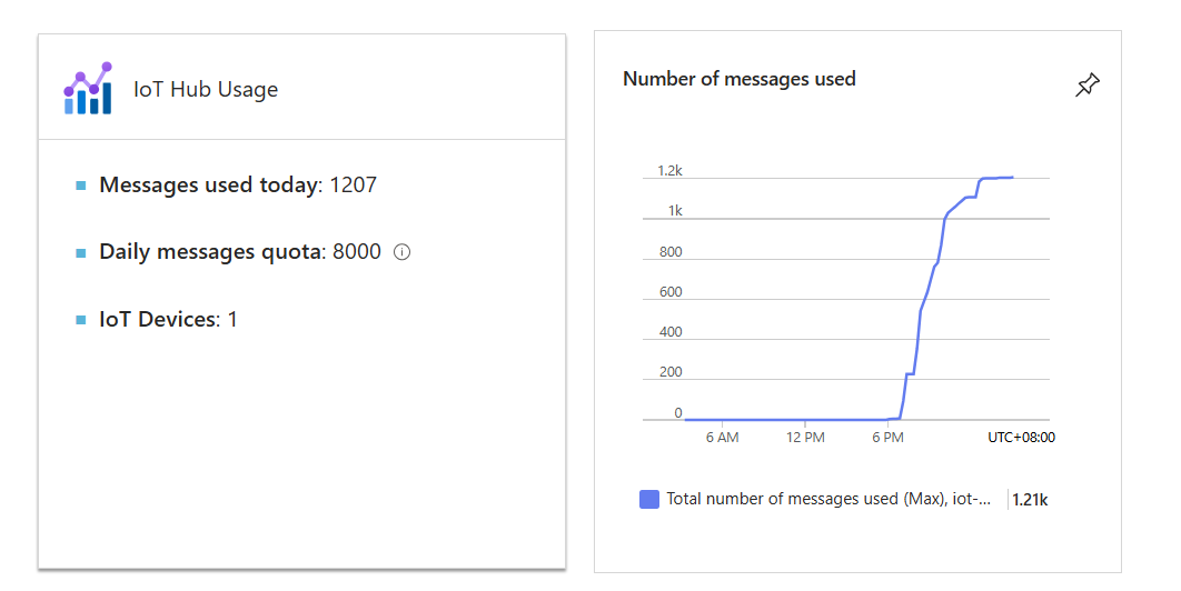 Note that our IoT hub cannot directly display the data content; it can only display the number of messages sent over, as shown in the figure: